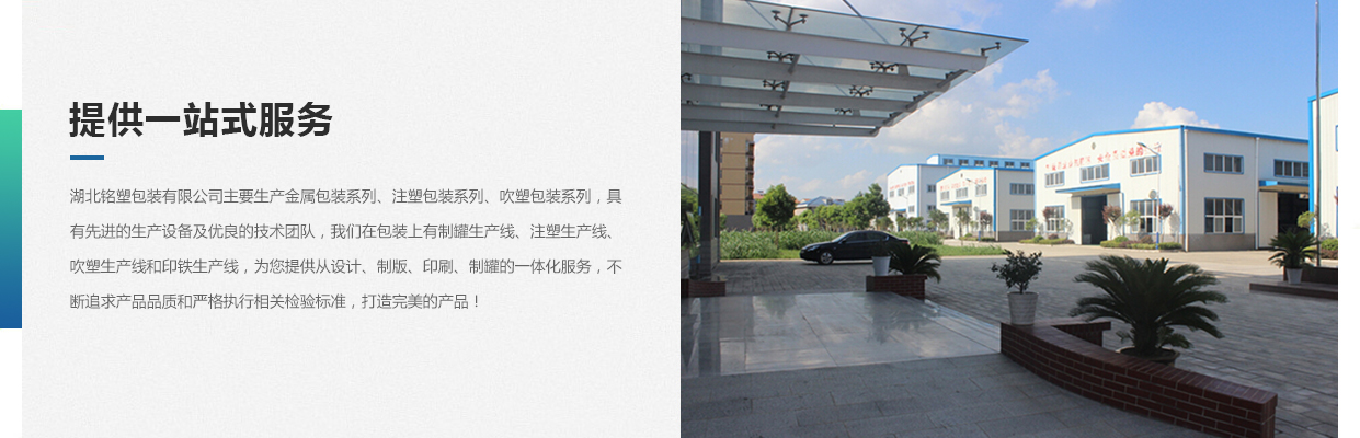湖北銘塑包裝有限公司一家集研發(fā)、生產(chǎn)、銷售于一體的較優(yōu)秀民營企業(yè),技術力量雄厚,產(chǎn)品質(zhì)量可靠。位于交通暢順,百業(yè)興旺、經(jīng)濟富裕、政策開放的孝感開發(fā)區(qū)域。我們企業(yè)的營銷戰(zhàn)略是以建筑為土壤,以產(chǎn)品為種子,以質(zhì)量為肥料,讓綠色鋪滿全球。憑借多年來的行業(yè)經(jīng)驗,公司不斷進行創(chuàng)新和研發(fā),為市場提供更廣泛的產(chǎn)品應用領域和更好環(huán)保節(jié)能產(chǎn)品,為國家能源環(huán)保戰(zhàn)略和可持續(xù)發(fā)展戰(zhàn)略作出應有的貢獻。     湖北銘塑包裝有限公司主要生產(chǎn)金屬包裝系列、注塑包裝系列、吹塑包裝系列,具有先進的生產(chǎn)設備及優(yōu)良的技術團隊,我們在包裝上有制罐生產(chǎn)線、注塑生產(chǎn)線、吹塑生產(chǎn)線和印鐵生產(chǎn)線,為您提供從設計、制版、印刷、制罐的一體化服務,不斷追求產(chǎn)品品質(zhì)和嚴格執(zhí)行相關檢驗標準,打造更好的產(chǎn)品!